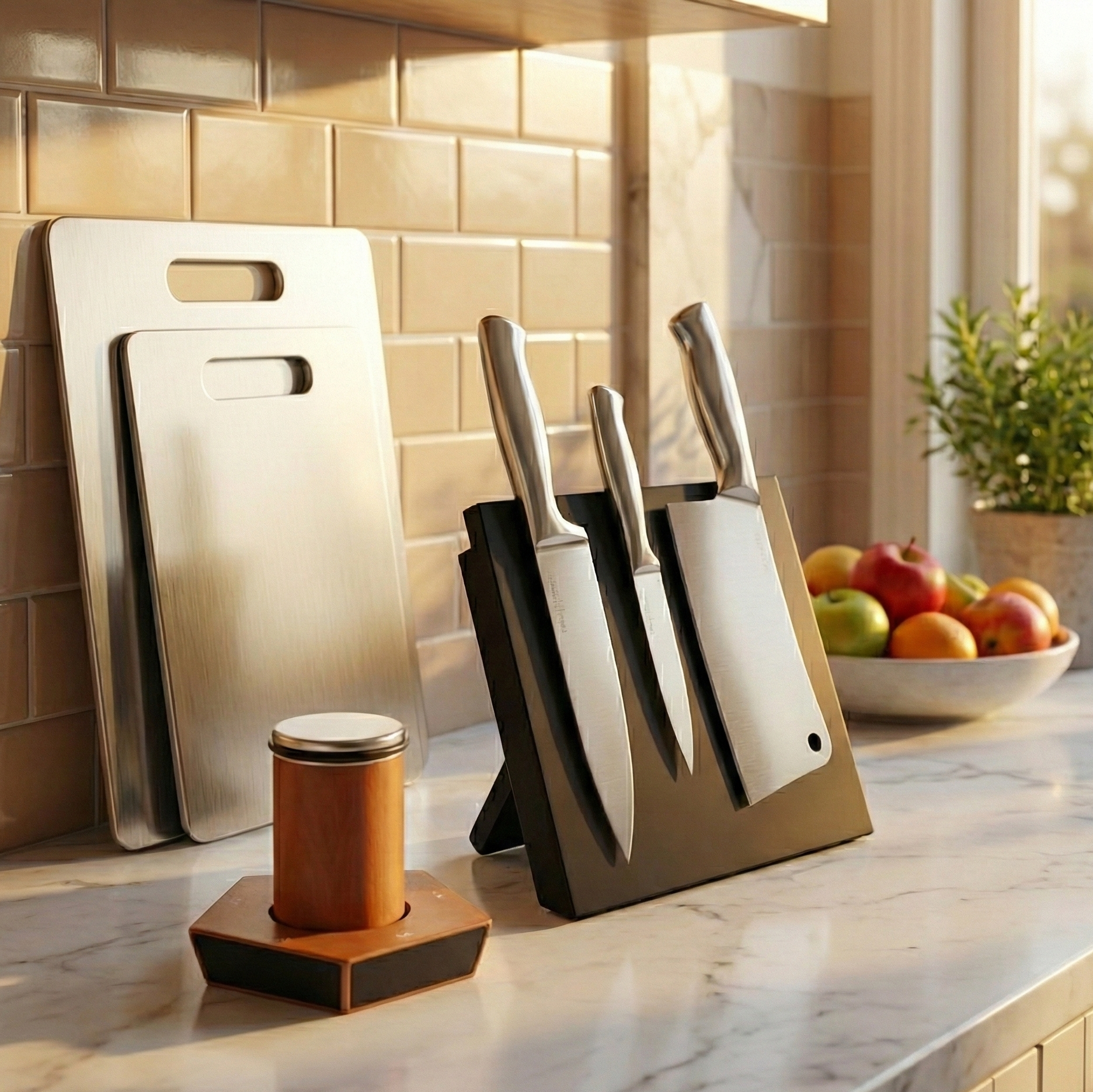The two Stainless Steel Chopping Boards are 100% dishwasher safe and can be sanitized with high heat, making them the easiest boards you will ever own. For the Rolling Sharpener and your chosen Magnetic Holder (Rack or Block), simply wipe them down with a damp cloth to keep them dust-free and looking new.