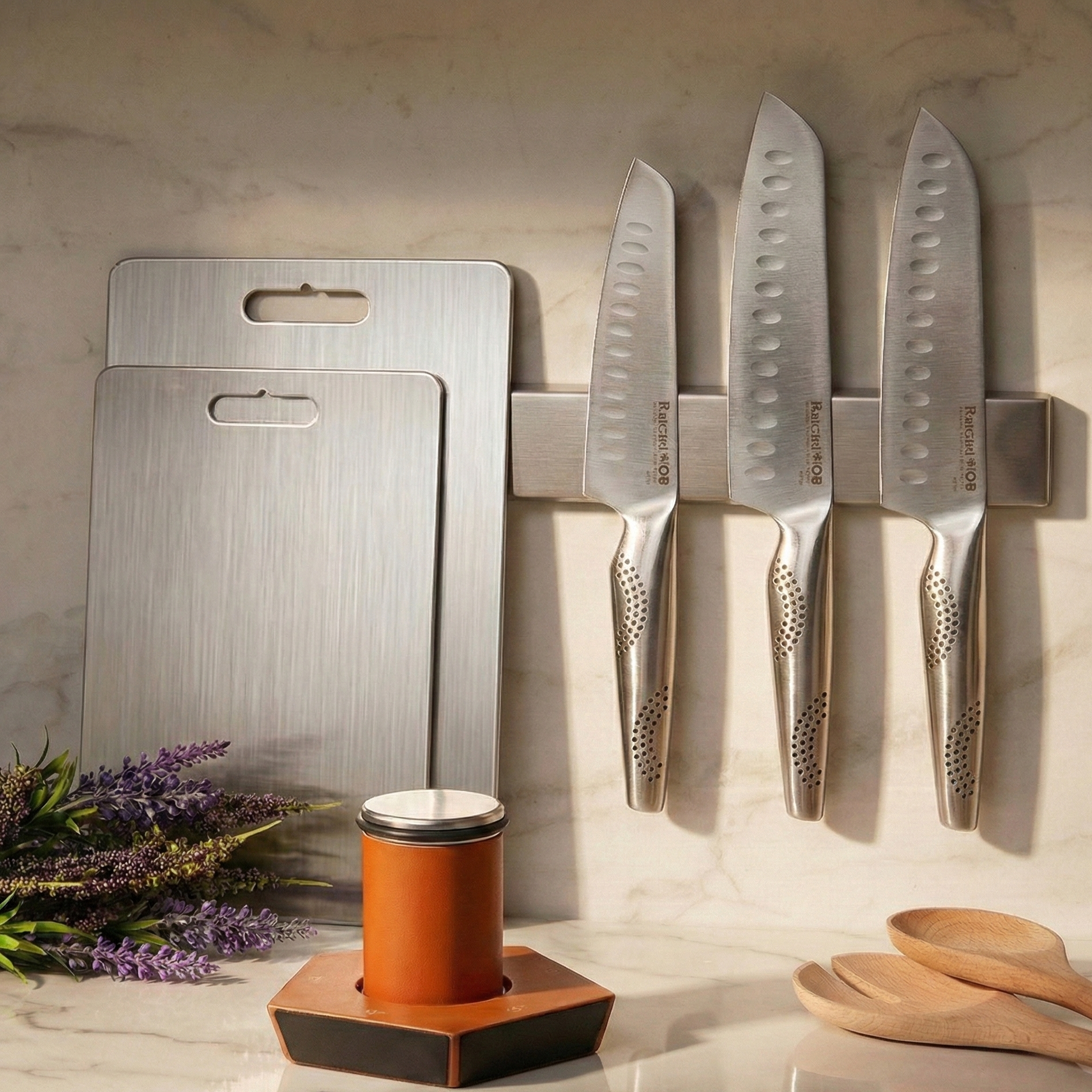 Magnetic Knife Block: A stunning countertop statement piece that holds knives securely without trapping moisture like traditional slotted blocks.