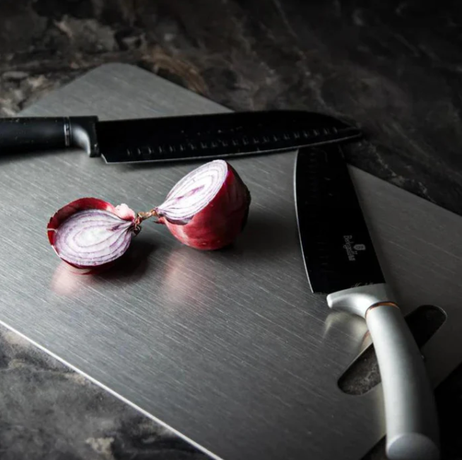 2. Stainless Steel Chopping Boards (20x30cm and 28x39cm) - Say goodbye to mouldy, scarred, and smelly cutting boards. This bundle includes two sizes of our premium stainless steel boards to handle everything from quick garnishes to heavy meat prep.
